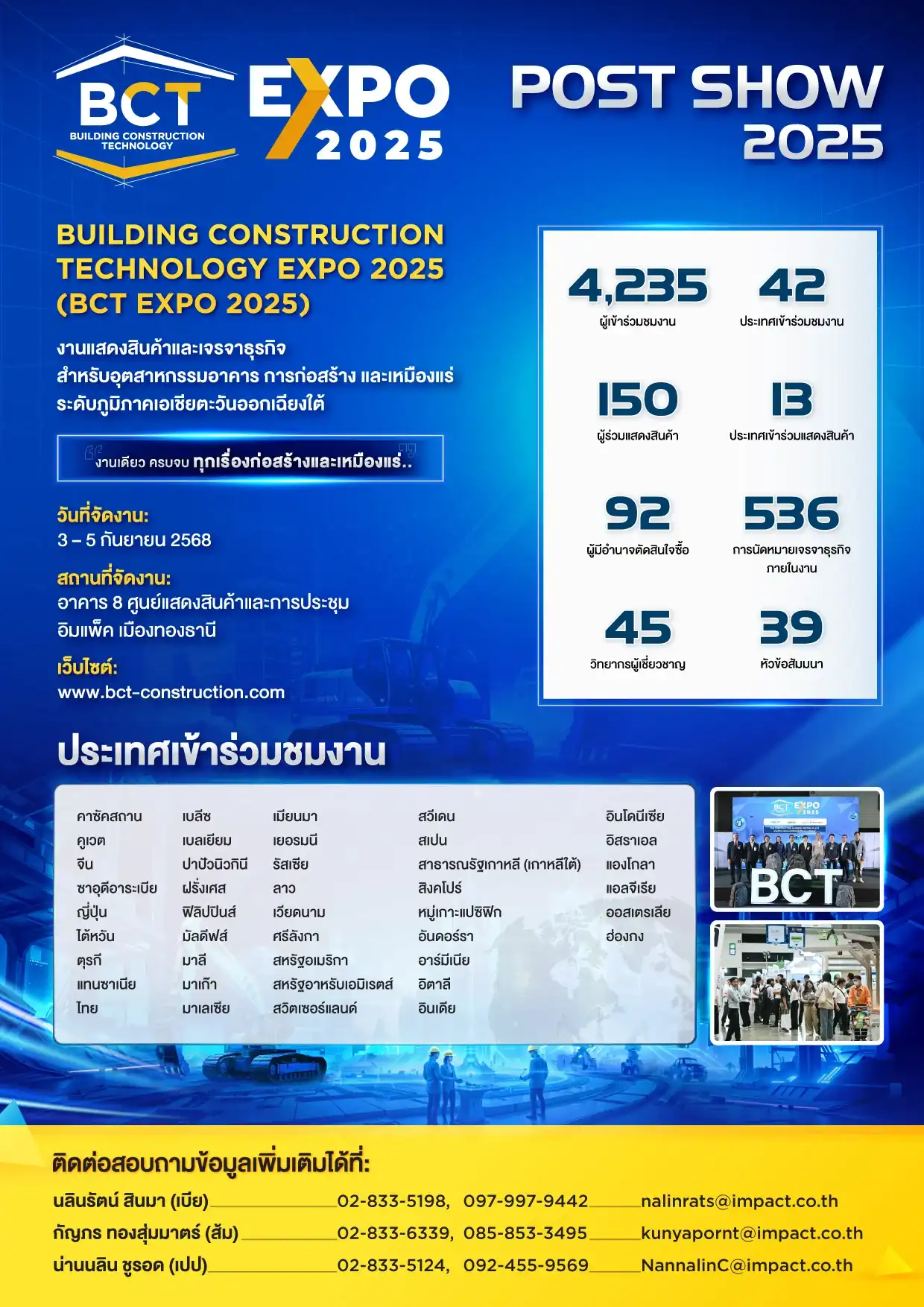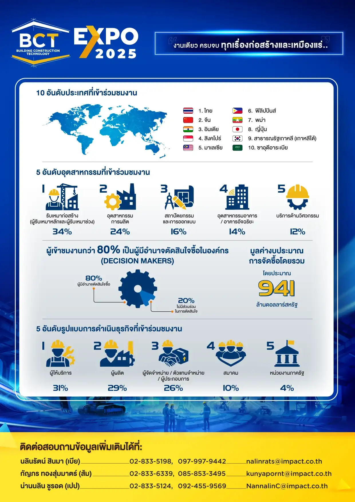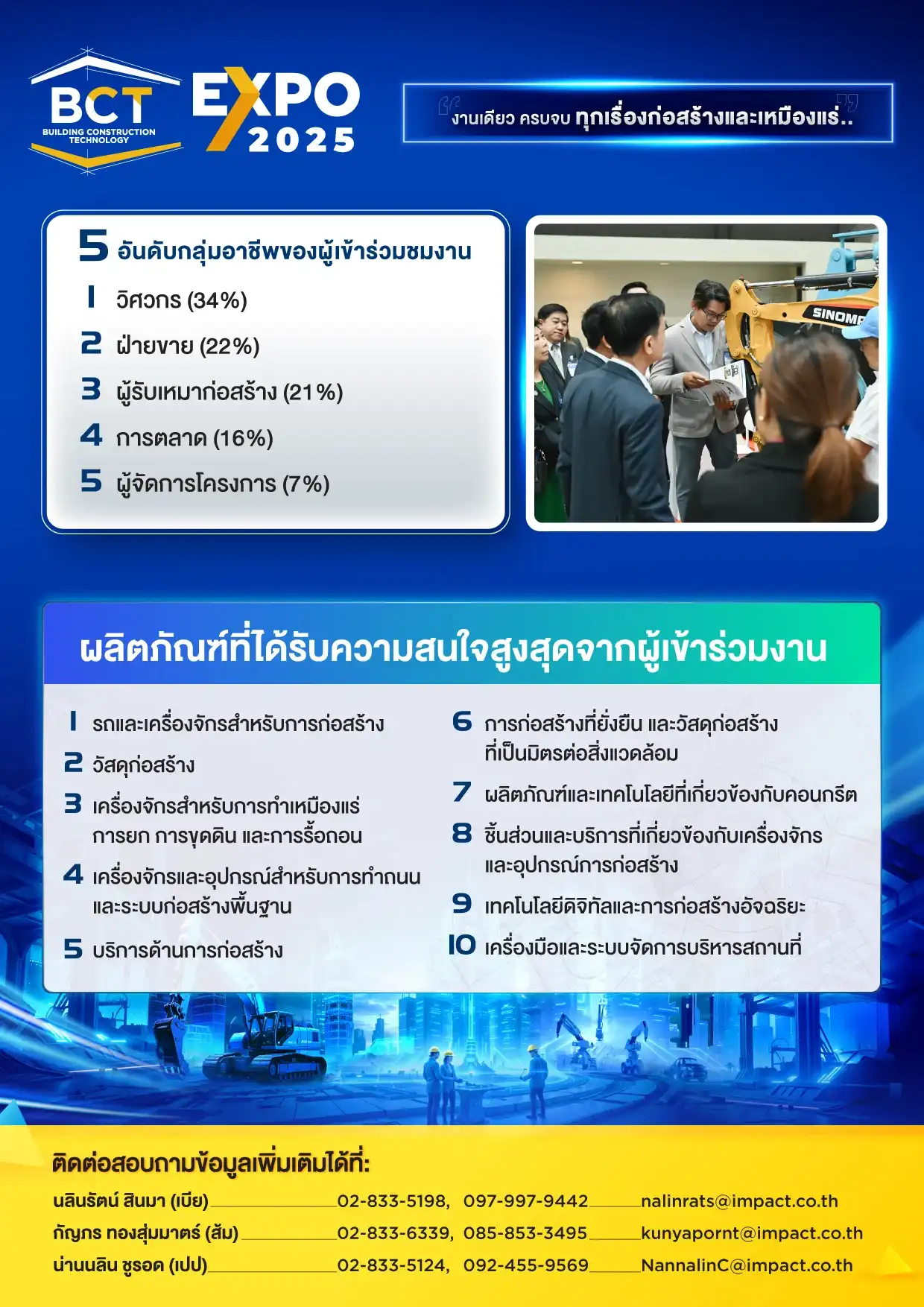 Organized as your construction and mining meeting place, BCT Expo will present and showcase a comprehensive range of machinery, equipment, tools, materials, smart facility management, building information modeling (BIM), AI & robotics, drone, solutions, construction safety, technology and services impacting building and construction efficiency by more than 150 exhibiting companies to over 4,000 trade professionals from the ASEAN region, representing all sectors of the building, construction, and mining industries.